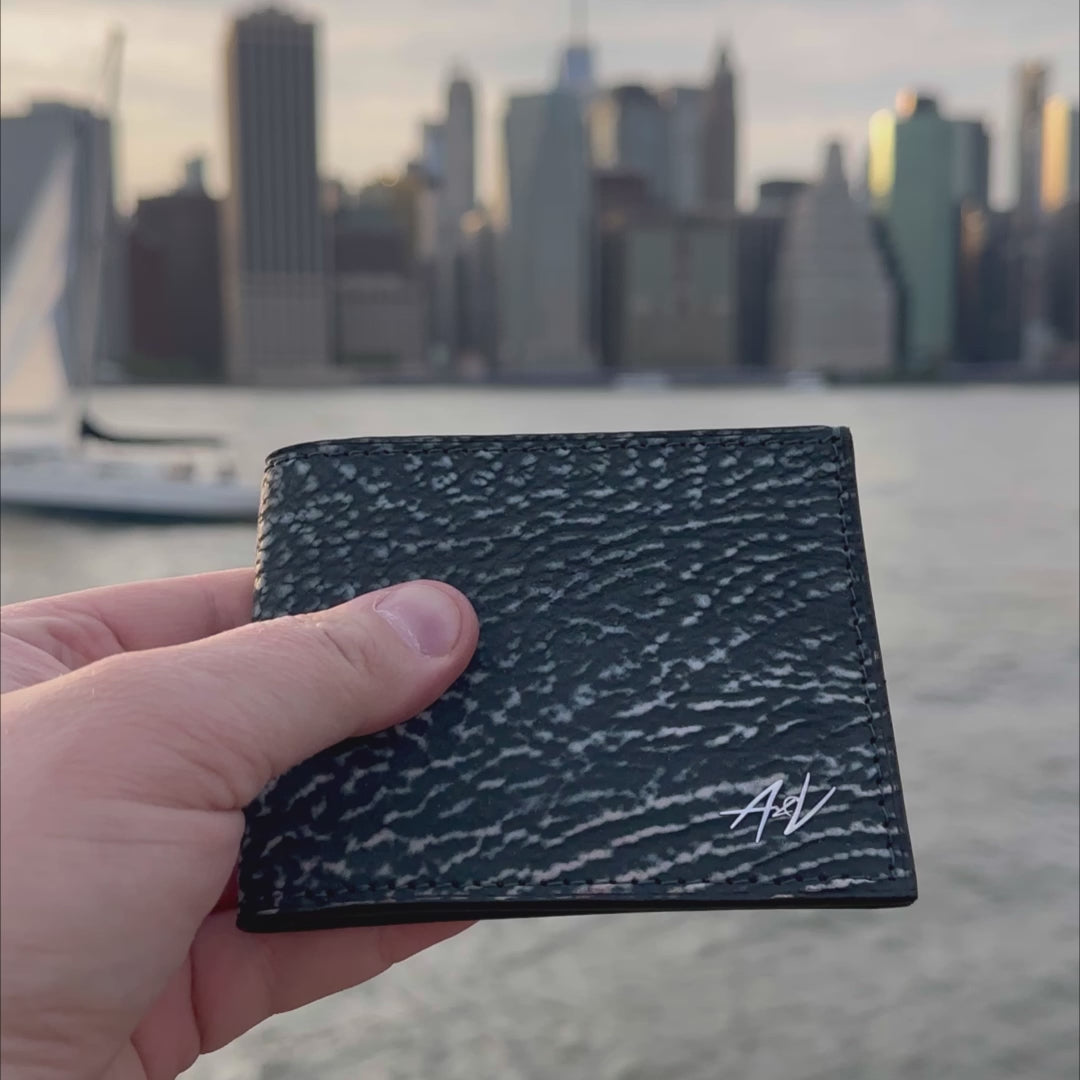 Shark skin is one of the strongest known to man (for example, it is 10 times stronger than calf skin). Its unique texture and sophistication will satisfy the requirements of even the most demanding customers. Shark skin is covered with placoid scales, similar in composition to tooth enamel. Due to this strength, the skin of a shark is a kind of armor against mechanical damage and bites from other predators. It is difficult to pierce even with a knife. Even in ancient times, the skin of a shark was used to make shields and wrap the hilts of swords. The skin of a shark is very rough to the touch, but dressed shark skin is rough, smooth, and silky. The texture has a speckled appearance which is the most eye-catching. It is very durable and resistant to abrasion. Sharkskin accessories are comfortable and waterproof.
