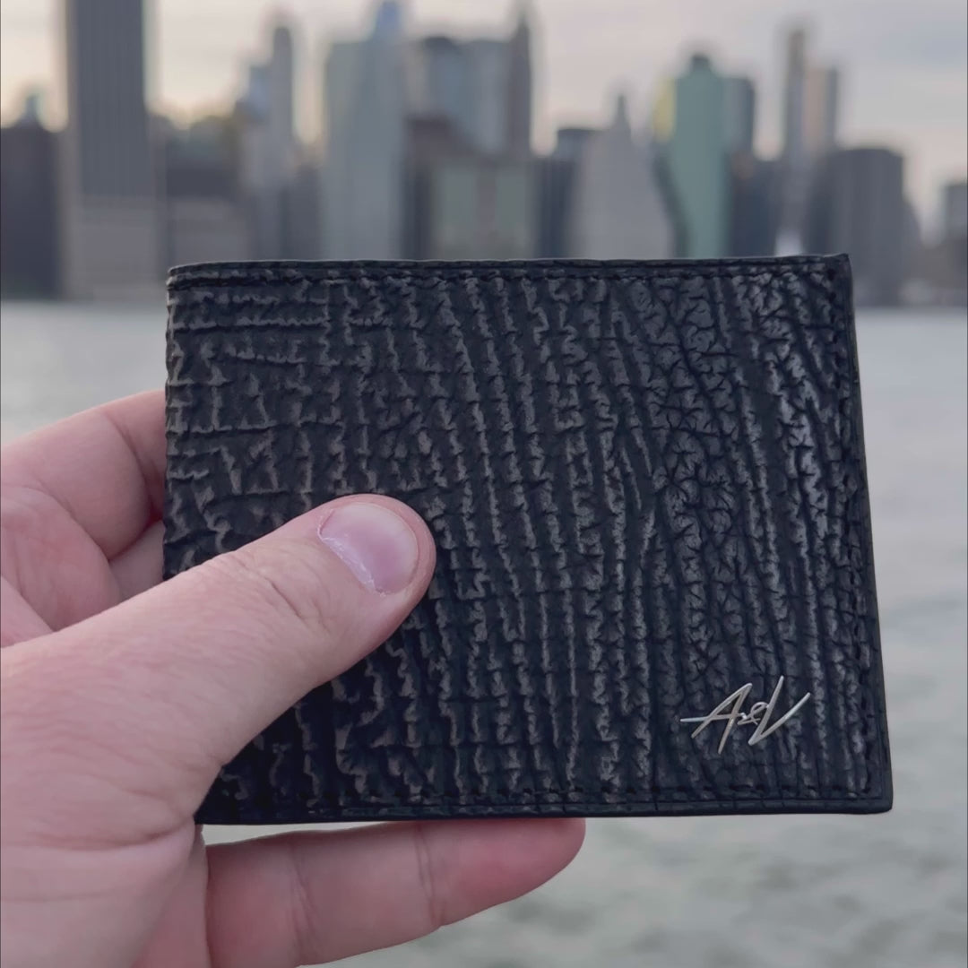 Shark skin is one of the strongest known to man (for example, it is 10 times stronger than calf skin). Its unique texture and sophistication will satisfy the requirements of even the most demanding customers. Shark skin is covered with placoid scales, similar in composition to tooth enamel. Due to this strength, the skin of a shark is a kind of armor against mechanical damage and bites from other predators. It is difficult to pierce even with a knife. Even in ancient times, the skin of a shark was used to make shields and wrap the hilts of swords. The skin of a shark is very rough to the touch, but dressed shark skin is rough, smooth, and silky. The texture has a speckled appearance which is the most eye-catching. It is very durable and resistant to abrasion. Sharkskin accessories are comfortable and waterproof.